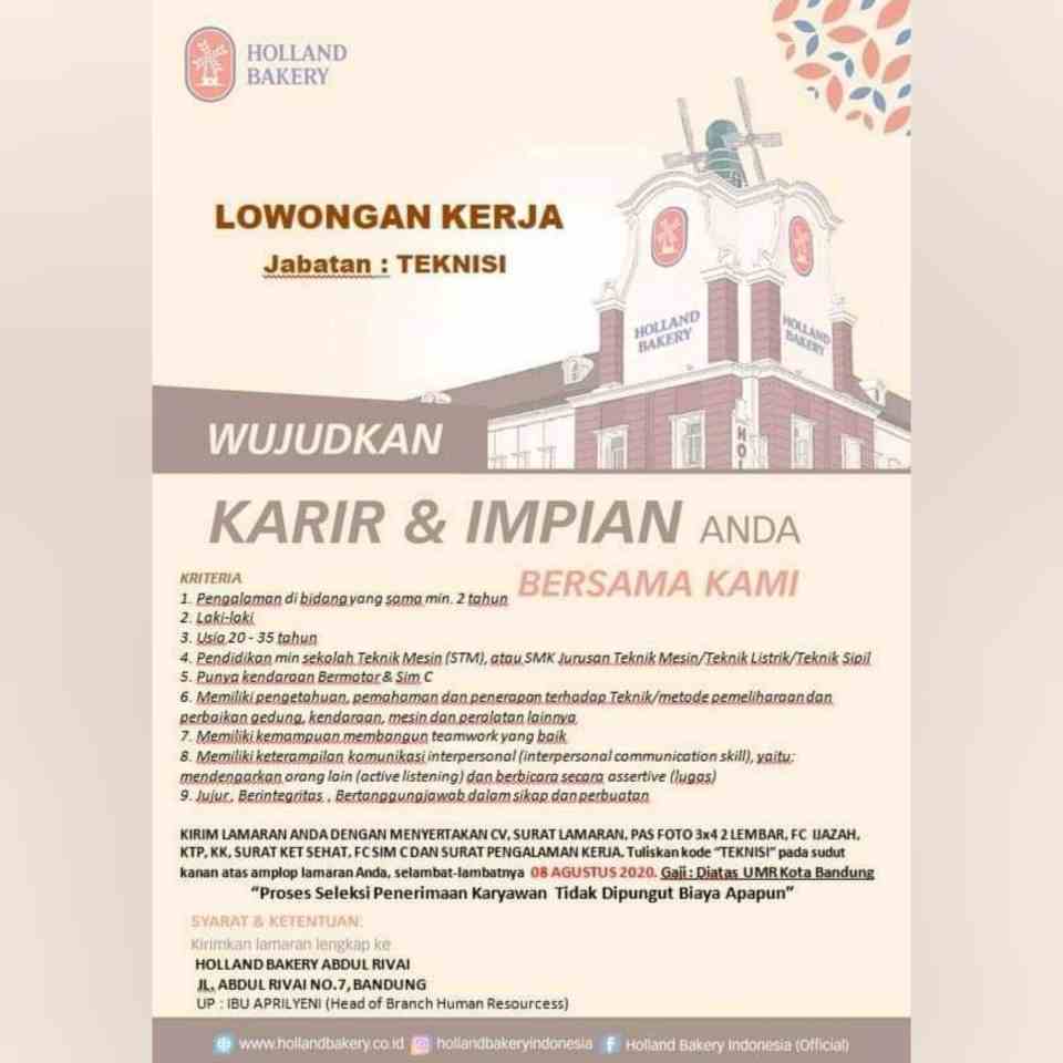 Bagi kamu yang saat ini sedang mencari pekerjaan di Holland Bakery khususnya area Bandung. Berikut kami sampaikan informasi mengenai posisi yang tersedia, persyaratan, dan cara mengirimkan lamarannya.